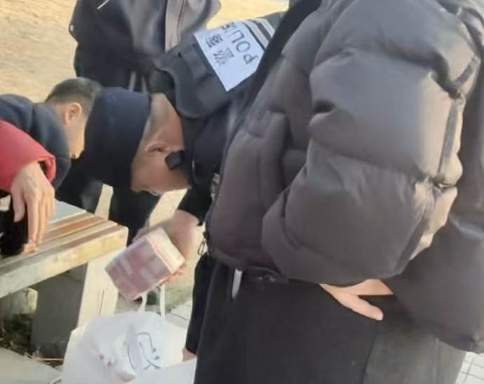在等待民警到场的这段时间里,田一鸣始终坚守在长凳旁,寸步不离地守护着这袋“意外之财”。现场围观群众纷纷称赞:“这附近根本没有监控,就算有人拿几万块走,也没法查证。小伙子能这么沉得住气,真是太难得了!”