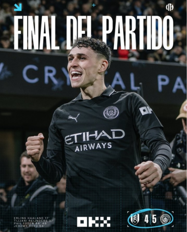 下半场开场仅仅3分钟,曼城再次扩大比分。原本是富勒姆的一次进攻机会,但曼城后场完成抢断,多库前场左路长驱直入,并送出直塞到禁区,哈兰德中路没有选择停球,而是顺势将球过渡到后点,福登跟进包抄小角度推射破门,福登梅开二度,比分被改写为4-1!